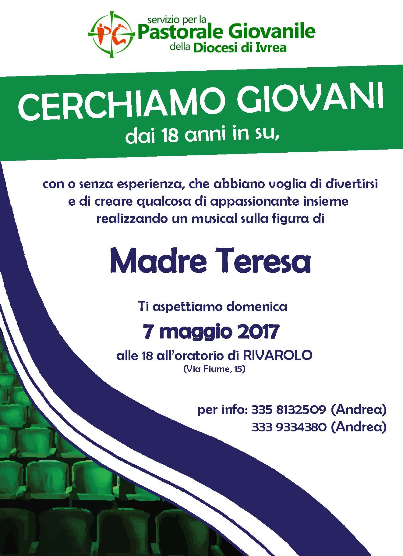 Ciò che più conta non sarà il prodotto ma il processo attraverso il quale scoprire la vita di questa santa straordinaria, una “matita nelle mandi di Dio”, come si definiva Madre Teresa. L’invito è rivolto ai tutti i giovani di età compresa tra i 18 e i 35 anni che abbiano voglia di mettersi in gioco (canto, ballo, recitazione, scenografie, dietro le quinte.. c’è posto per tutti!). Il progetto si svolgerà in tre fasi: la prima, fino alla prossima estate, per presentare e far conoscere il Progetto nelle diverse zone della diocesi. Poi, a partire dall’autunno, l’inizio delle prove per poi arrivare, a Dio piacendo, alla primavera/estate 2018 per la “prima” del musical. Un cammino che vuole coinvolgere tanti giovani in un’esperienza che non sarà mai chiusa ma in ogni momento sarà pronta ad “agganciare” e accogliere chi vorrà esserci. Il cammino iniziato il 19 marzo a Strambino, continua con il secondo appuntamento domenica 7 maggio a Rivarolo. Chi è interessato è invitato a venire alle ore 18 presso l’Oratorio San Michele di Rivarolo per conoscerci e iniziare a sognare! L’incontro è aperto a tutti.