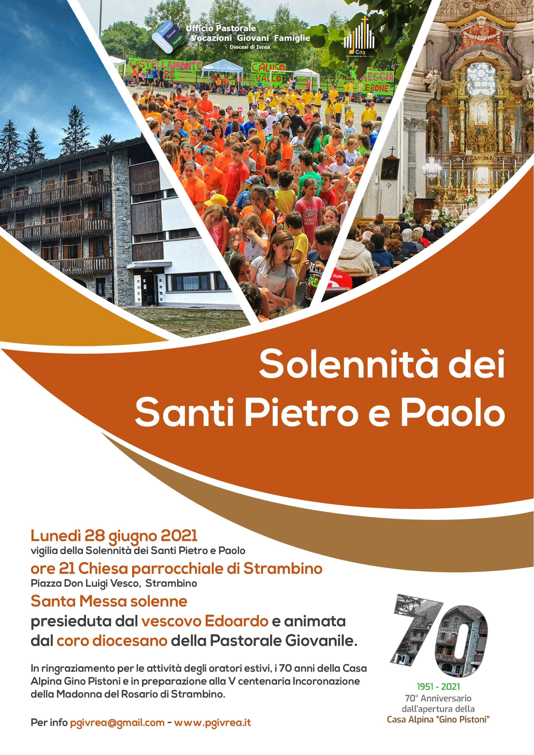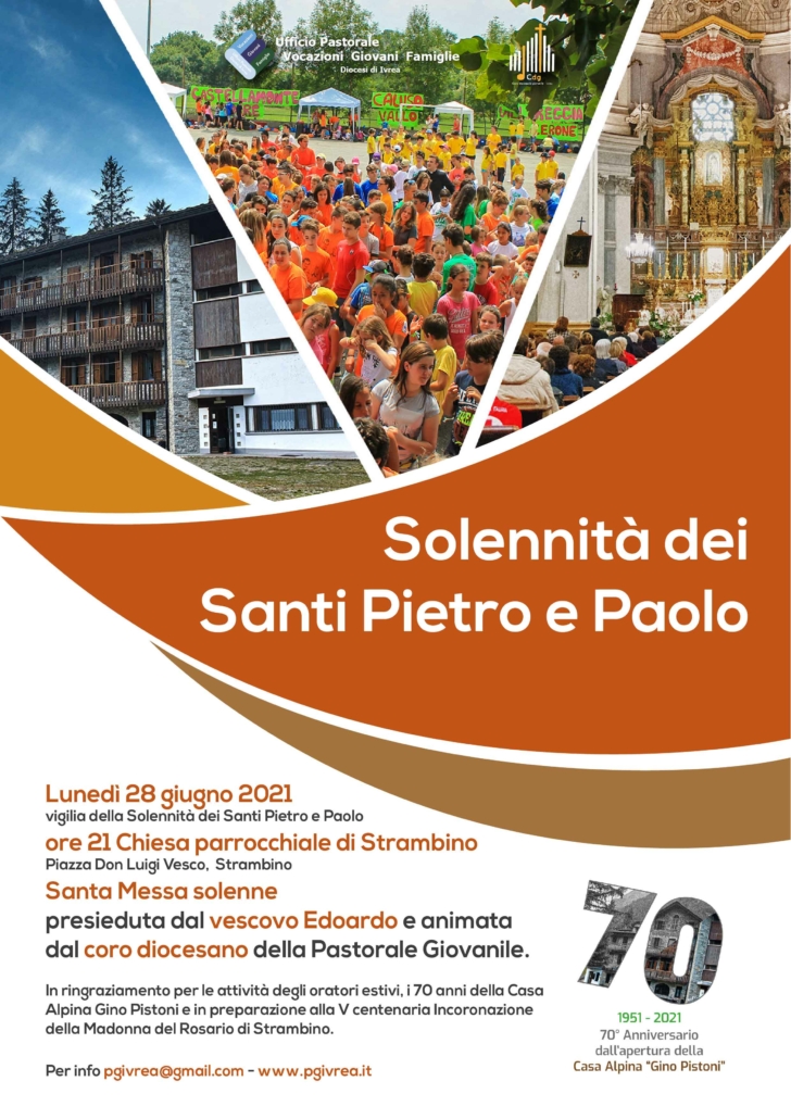 Il prossimo appuntamento in presenza è previsto lunedì 28 giugno, vigilia della solennità dei Santi Pietro e Paolo, nella chiesa parrocchiale di Strambino: alle 21 il vescovo monsignor Edoardo Cerrato presiederà una Messa solenne “in ringraziamento per le attività degli oratori estivi”, che hanno ripreso a funzionare già in queste ultime due settimane, “per i 70 anni della Casa Alpina Gino Pistoni e in preparazione alla V centenaria incoronazione della Madonna del Rosario di Strambino”. La celebrazione sarà animata dal coro diocesano della Pastorale giovanile.
