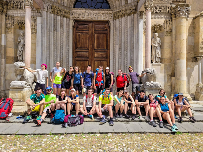 Durante il percorso incontriamo Massimo che gentilmente ci offre il cortile della sua cascina per celebrare la Messa. Lungo l’ultimo tratto della tappa il caldo e la stanchezza iniziano a farsi sentire, ma una volta arrivati a Fidenza ci aspetta una rinfrescante granita. In seguito ci dirigiamo verso la cattedrale dove, una volta scattate le ultime foto tra i due imponenti leoni stilofori della facciata, abbiamo giusto il tempo di salutarci prima di dover raggiungere chi la stazione e chi il pulmino.