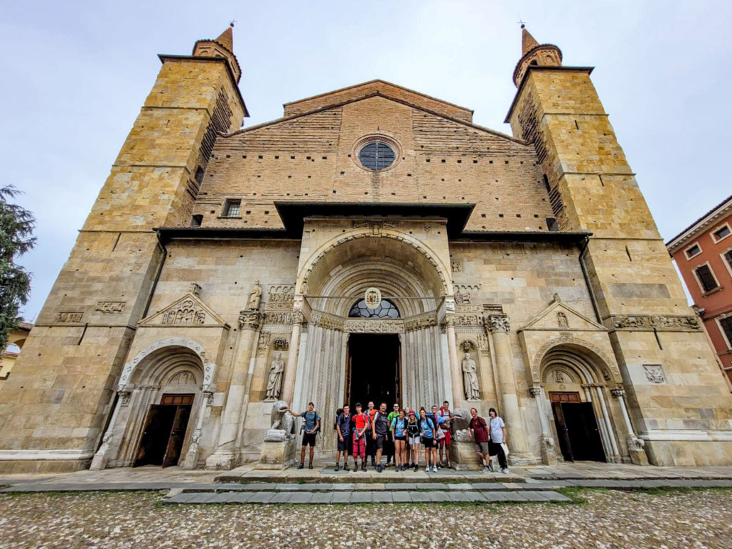 La nostra prima sosta è stata alla Cattedrale di Fidenza dedicata a San Donnino, martire del III secolo d.C. Dopo il primo timbro alla credenziale e una breve visita all’oratorio guidati dal Parroco della cattedrale don Gian Emilio, abbiamo celebrato la santa Messa.