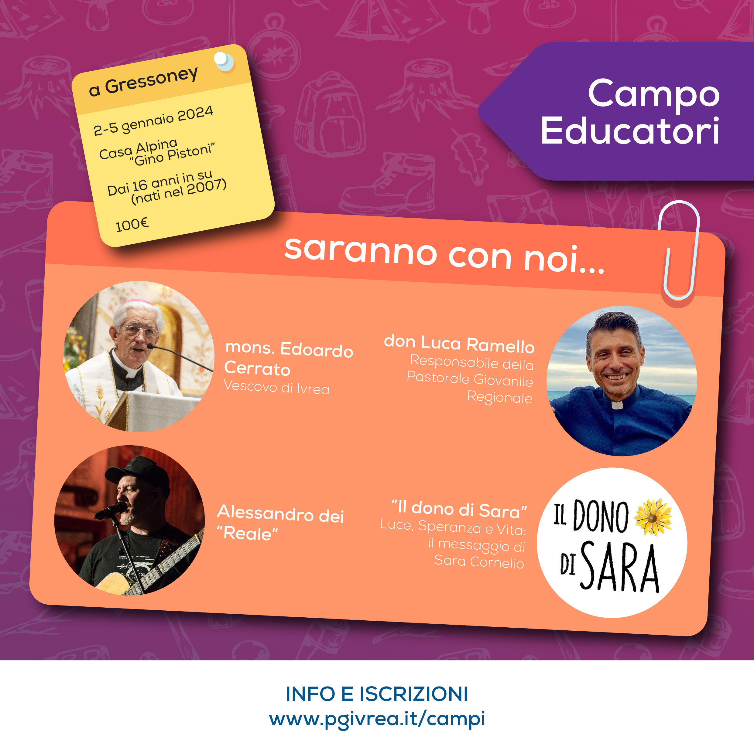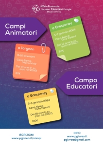 Dalla mattinata del 2 gennaio 2024 al pranzo del 5, presso la casa alpina “Gino Pistoni” di Gressoney, si terrà un CAMPO EDUCATORI (dai 16 anni in su, nati nel 2007) organizzato dall’Ufficio Pastorale Vocazioni-Giovani-Famiglie e dedicato a tutti i giovani impegnati nelle realtà parrocchiali della diocesi.