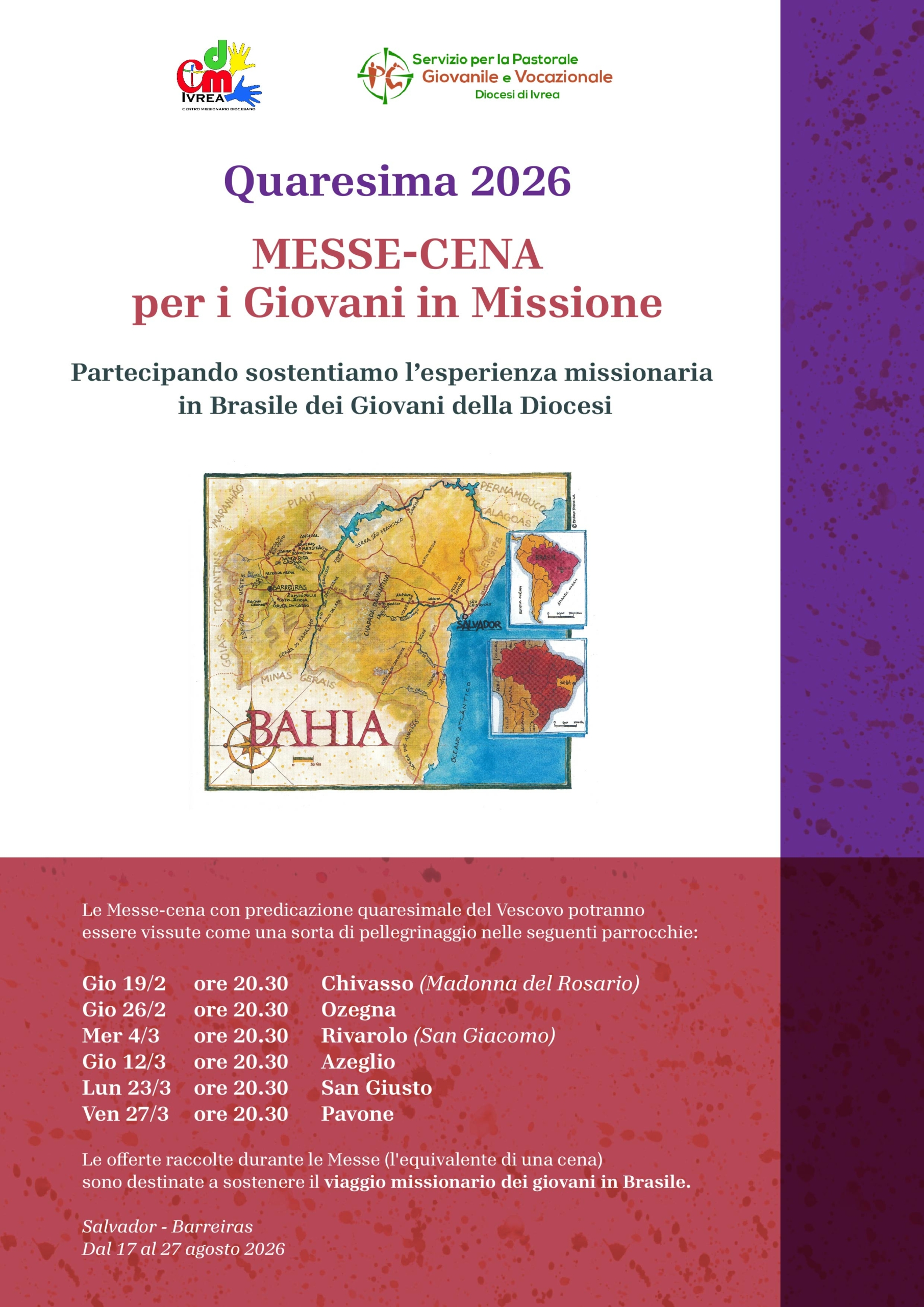 Le offerte raccolte durante le Messe (l’equivalente di una cena) sono destinate a sostenere il viaggio missionario dei giovani in Brasile.